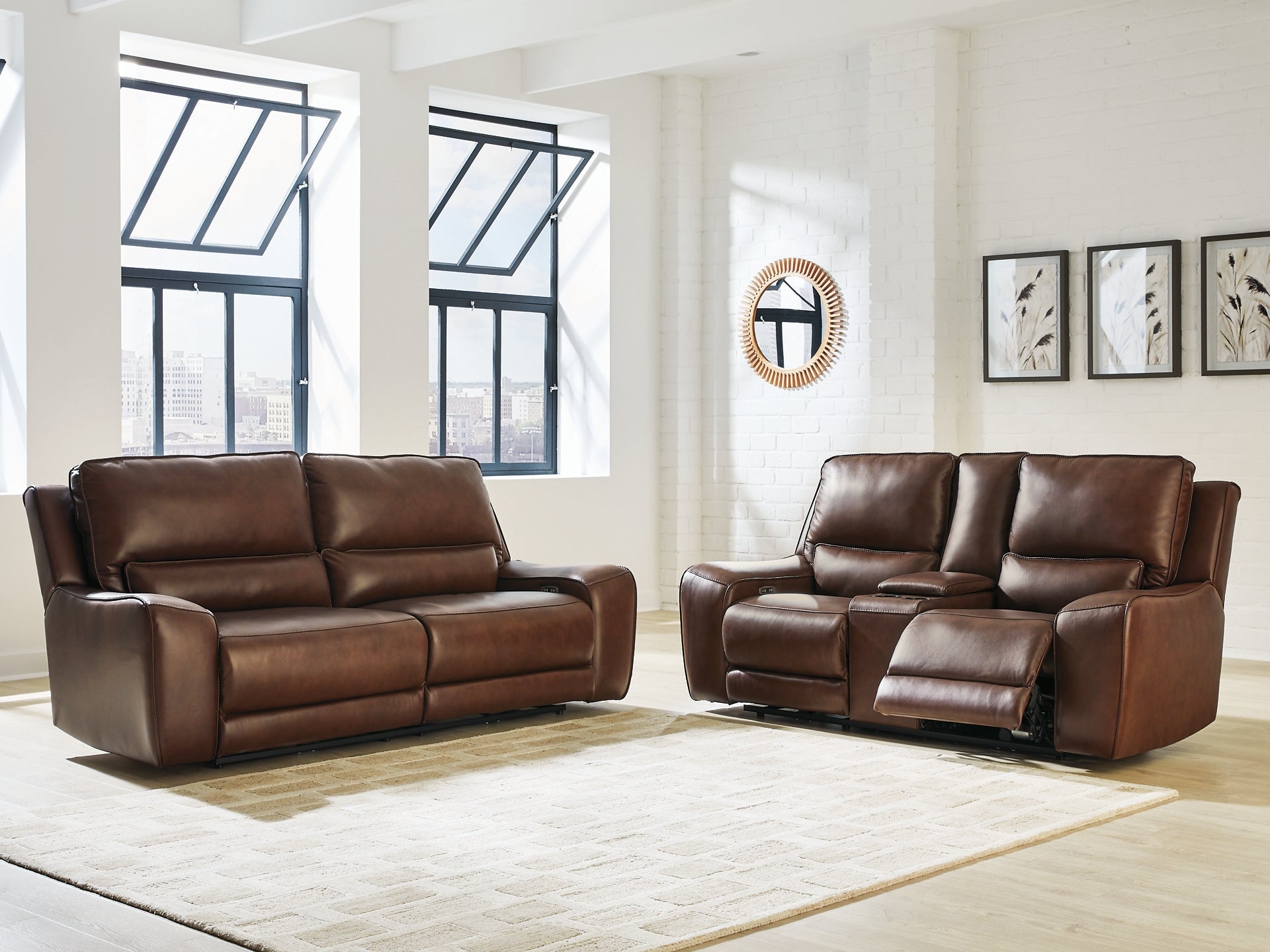 Live and lounge luxuriously. This power reclining seating package brings an ultra-stylish flair to your home’s central hub. Its seating areas are wrapped in top grain leather in a sleek neutral color, giving you a trend-right look made all the better with high-quality materials. And with the simple push of a button, you can adjust the headrests or recline to find your ideal comfort position.